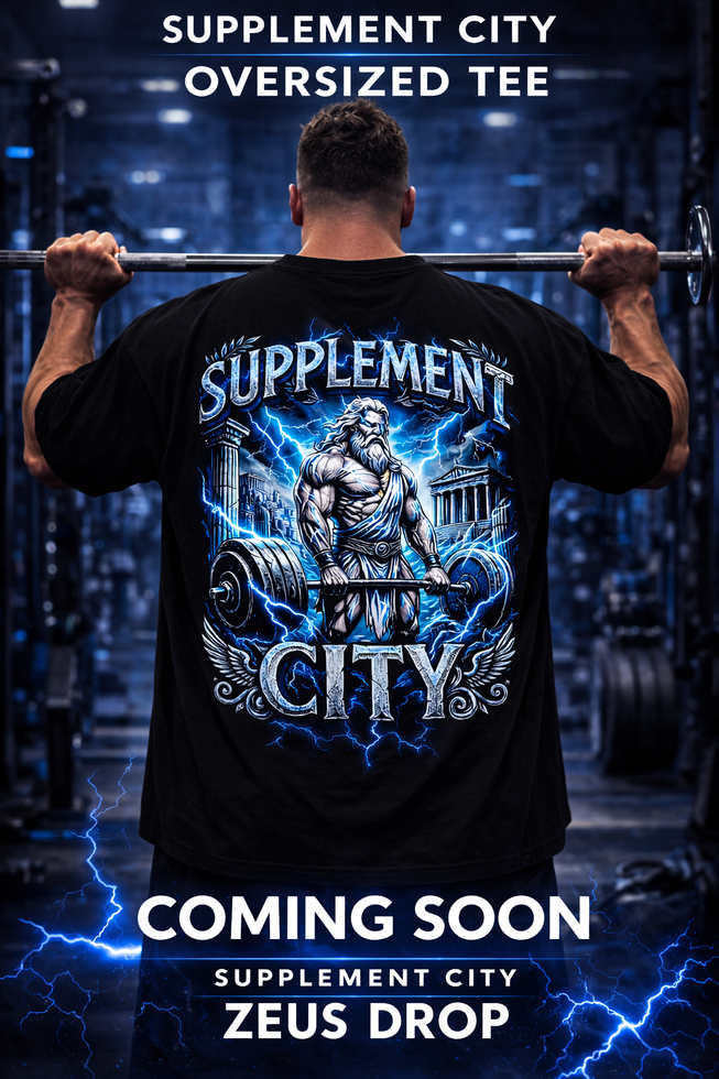 The back graphic features Zeus lifting heavy iron surrounded by lightning and ancient Greek temples, symbolising raw power and unstoppable energy. The bold SUPPLEMENT CITY branding and electric blue lightning effect make this piece stand out both in the gym and on the street.